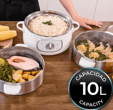 Además, la capacidad total de 10 litros proporciona un amplio espacio para cocinar diferentes tipos de alimentos simultáneamente. Esta característica es ideal para familias o para quienes disfrutan de preparar varias comidas a la vez. La vaporera cuenta con varias bandejas apilables que permiten cocinar verduras, carnes y pescados en un solo ciclo, optimizando así el uso del tiempo y del espacio en la cocina.